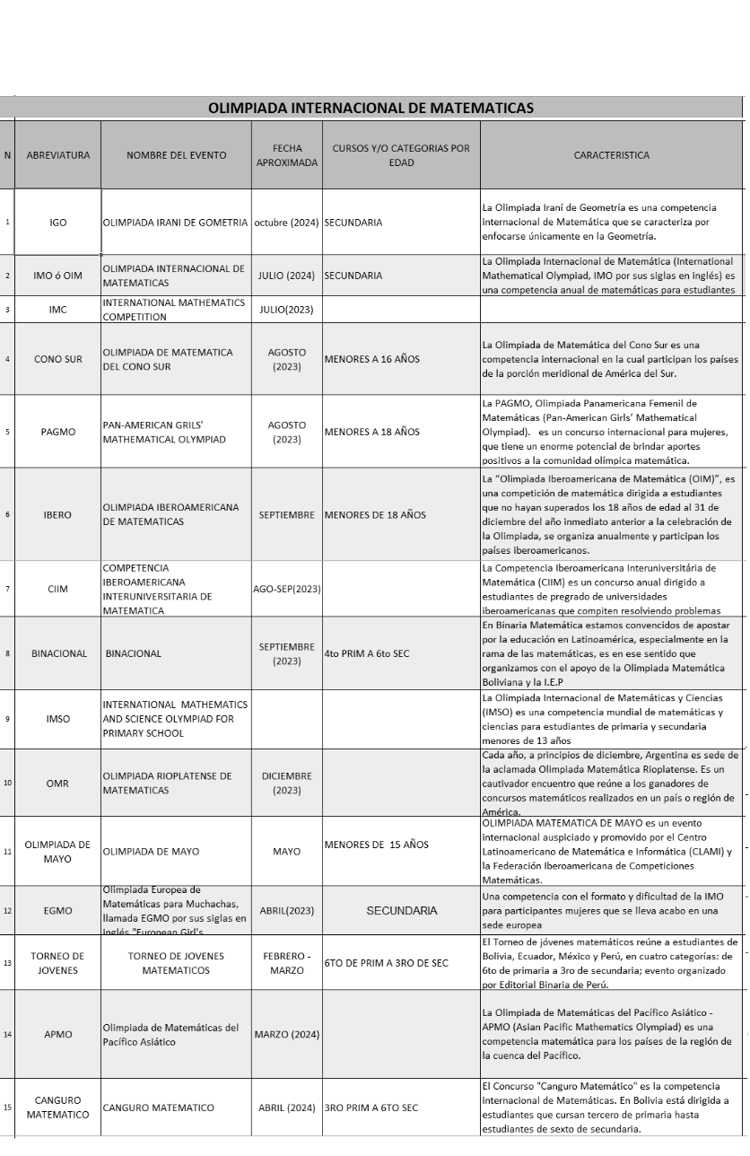 El presente documento es una recopilación de información (de gestiones anteriores) sobre los eventos de Olimpiadas Matemáticas a nivel internacional, con el propósitos de dar a conocer a los estudiantes para ir preparándose con anticipación.